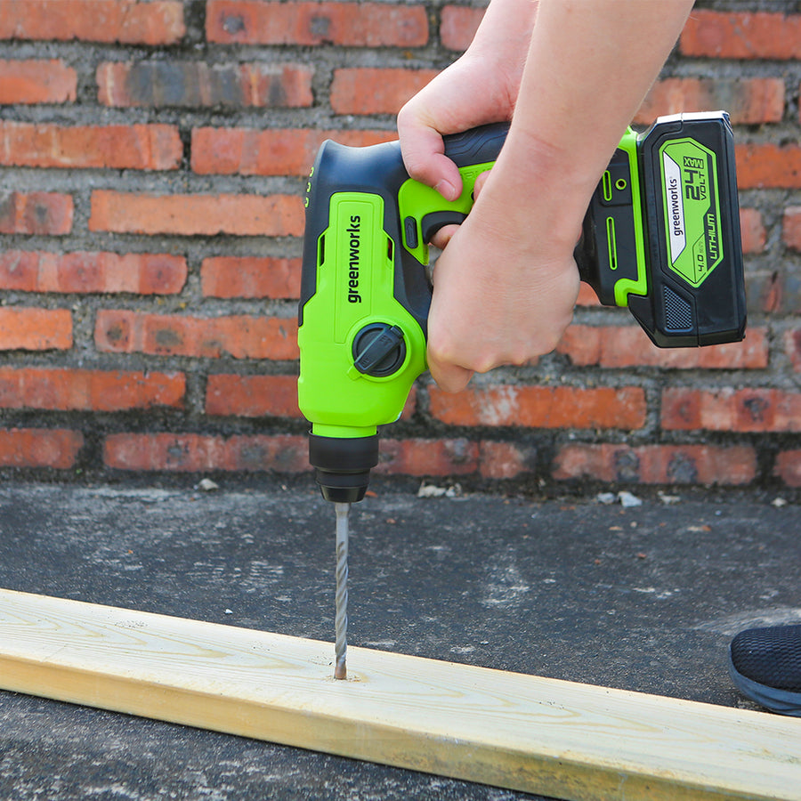 Le Greenworks GD24SDS1 est un marteau perforateur 24 volts robuste, léger et puissant conçu pour les travaux domestiques et de bricolage. Alimentée par une batterie lithium-ion avancée de 24 V, la machine offre des performances élevées malgré sa taille compacte. La commodité est garantie car vous n'avez pas besoin de manipuler les câbles d'alimentation, il vous suffit de brancher la batterie et de vous mettre au travail. La perceuse dispose d'un contrôle de vitesse variable pour un contrôle total et la fonction 4 en 1 permet le perçage, le martelage, le burinage, le Vario Lock et l'arrêt de la rotation. Le mandrin de perçage à action rapide SDS facilite le changement d'outils.