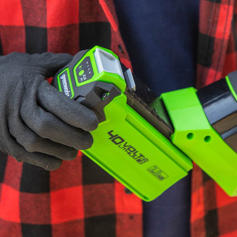Faisant partie de la famille Greenworks 40 V, la batterie peut être utilisée dans une gamme d'outils différents, des tondeuses à gazon aux taille-haies, en passant par les tronçonneuses et même les souffleurs/aspirateurs.