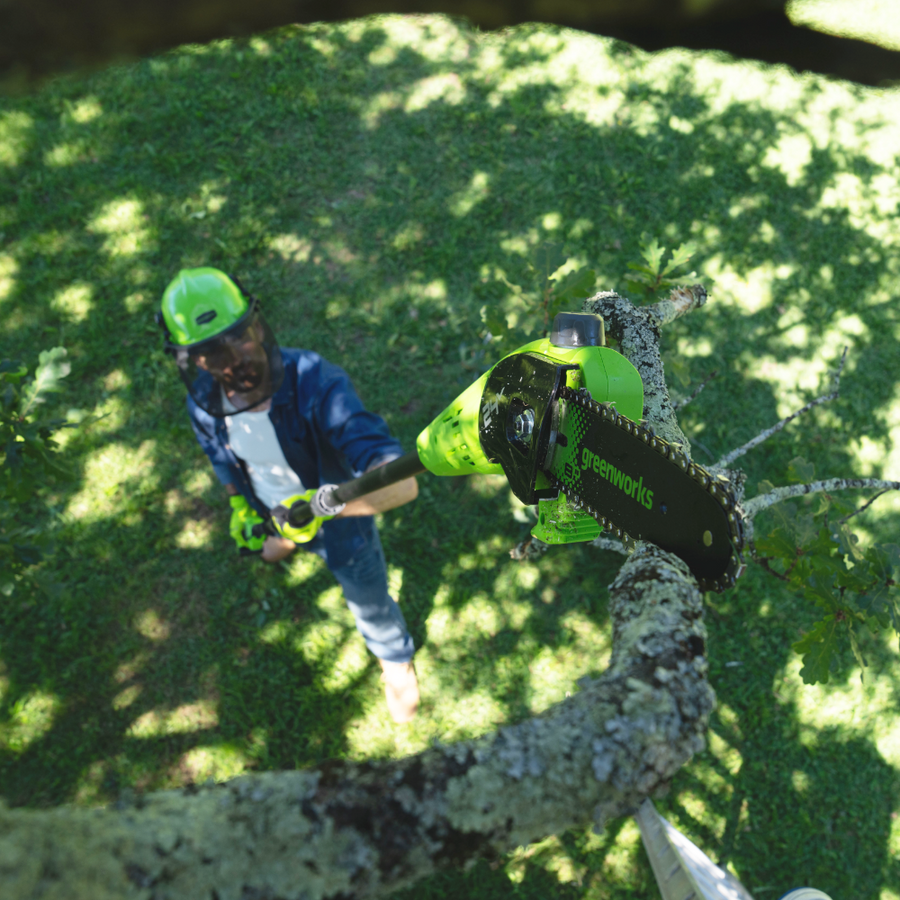 La Greenworks PS2002F est une élagueuse sur perche 24V légère, conçue pour couper les branches en hauteur. Avec une longueur de 2,7 m, tu peux facilement atteindre des branches jusqu’à 3 m sans compromettre la sécurité. Alimentée par une batterie lithium-ion 24V avancée, elle offre des performances élevées malgré sa taille compacte. Aucun carburant ni câble – insère simplement la batterie et commence à couper.